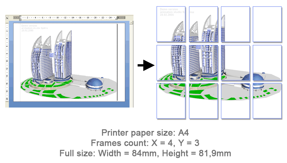 The poster does not necessary have a standard size. You can define its size by specifying the numbers of frames horizontally and vertically (fractional values are possible). The figure shows the poster containing 4x3 frames of A4 size, portrait orientation.